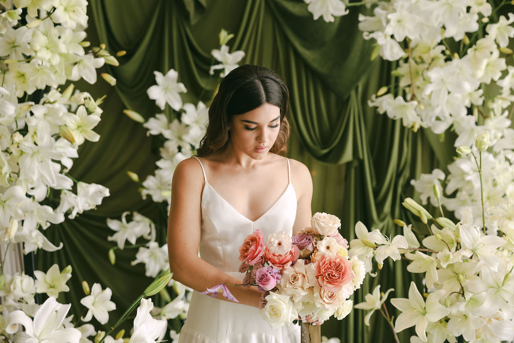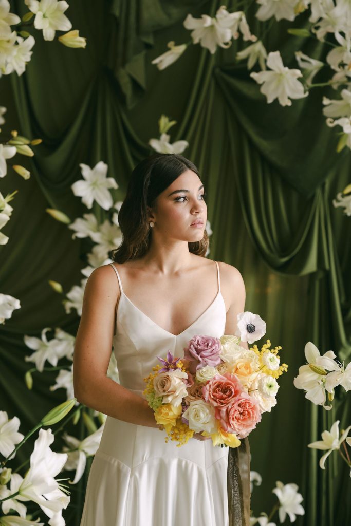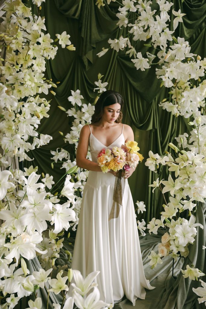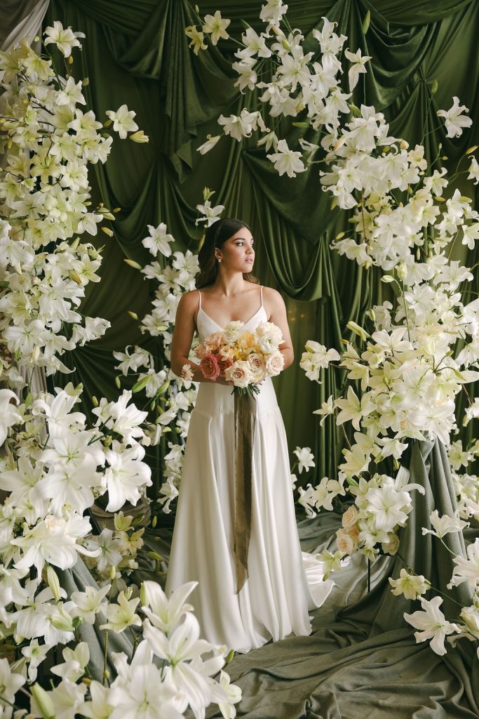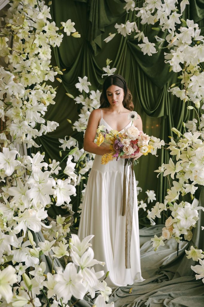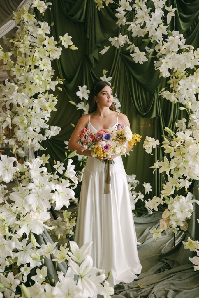 Image credits | Florists: Anli Wahl Floral Design + KADOU Floral Artistry | Photographer: Delicate Photography | Venue: The Venue, Paarl | Dress: Kobus Dippenaar | Model: Nikki Evert| Hair & makeup: Clarita Smit | Rigging, Draping + Arch structures: In & Out | Tabletop elements: Amour Tableware | Napery: Curated Events | Chairs, furniture and scatters: Palm Event Hire | Candles: Ohrr Candle Collective